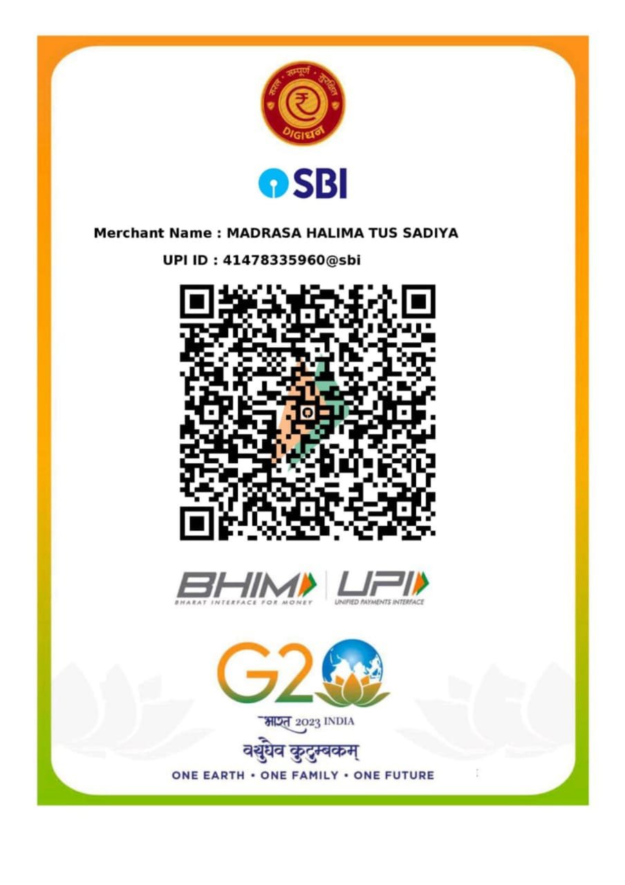 দান-খয়রাত ও সদকা-জাকাত ইসলামে বিধিবদ্ধ ইবাদত।দান-সদকার মাধ্যমে মানুষ বিপদ থেকে মুক্তি পায়। পরকালে দানকারীর জন্য বিশেষ পুরস্কারের ঘোষণা এসেছে হাদিসে। প্রকাশ্য ও গোপন সব দানেই সওয়াব রয়েছে, তবে গোপন দান উত্তম এবং আল্লাহর কাছে অত্যন্ত পছন্দনীয় আমল।পবিত্র কোরআনে বলা হয়েছে, ‘যারা নিজের সম্পদ দিনে বা রাতে প্রকাশ্যে অথবা গোপনে আল্লাহর পথে খরচ করে তাদের পুরস্কার তাদের প্রতিপালকের কাছে আছে। তাদের কোনো ভয় নেই। তাদের কোনো চিন্তাও নেই।’ -(সুরা বাকারা: ২৭৪)হাদীস শরীফে রাসুলুল্লাহ (স.) বলেন, ‘কেয়ামতের দিন যখন আরশের ছায়া ছাড়া কোন ছায়া থাকবে না, আল্লাহ তায়ালা সাত শ্রেণির মানুষকে তাঁর আরশের নিচে আশ্রয় দেবেন। তাদের মধ্যে একজন হলো ওই ব্যক্তি, যে এতো গোপনে দান করত যে, তার ডান হাতের দান বাম হাতও টের পেত না। -(বুখারি: ৬৬০, মুসলিম: ১০৩১)বুখারি ও মুসলিম শরিফে বর্ণিত, রাসূল (সা.) বলেন, ‘খেজুরের একটি অংশ দান করে হলেও তোমরা জাহান্নামের আগুন থেকে বেঁচে থাকার চেষ্টা কর।’। আপনি সহজেই আমাদের মাদরাসার জন্য আর্থিক সাহায্য করতে পারবেন। (1)সরাসরি অনলাইনের মাধ্যমে (2)সরাসরি অ্যাকাউন্ট নাম্বারে (3)UPI আইডিতে 41478335960@sbi বা madrasahalima@ybl (4)বারকোটের মাধ্যমে। নোট :- এখন যদি UPI আইডিতে দিতে চান। তাহলে UPI আইডি চেপে ধরে কপি করুন । যদি বারকোটের মাধ্যমে দিতে চান তাহলে অন্য মোবাইলে বারকোট ওপেন করে আপনার মোবাইলে স্ক্যান করুন। (বারকোট চেপে ধরে ডাউনলোড করলে বা স্ক্রিনশট নিলে একবারে 2000 এর বেশি পেমেন্ট পারবেন না) পেমেন্টের সময় মাদরাসার নাম দেখে নিবেন Madrasa Halima Tus Sadiya আল্লাহ আপনাদের উত্তম বদলা দান করুন - আমীন।